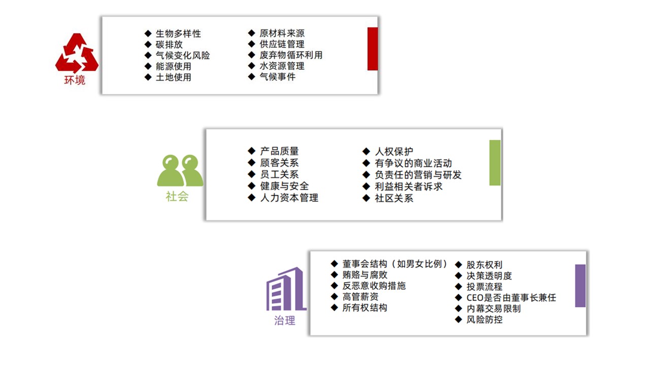 ESG的議題非常廣泛,跟環(huán)境、社會(huì)和治理高度相關(guān),并隨著社會(huì)和投資的發(fā)展而有所豐富和改善。目前來(lái)看,主要的議題包括: